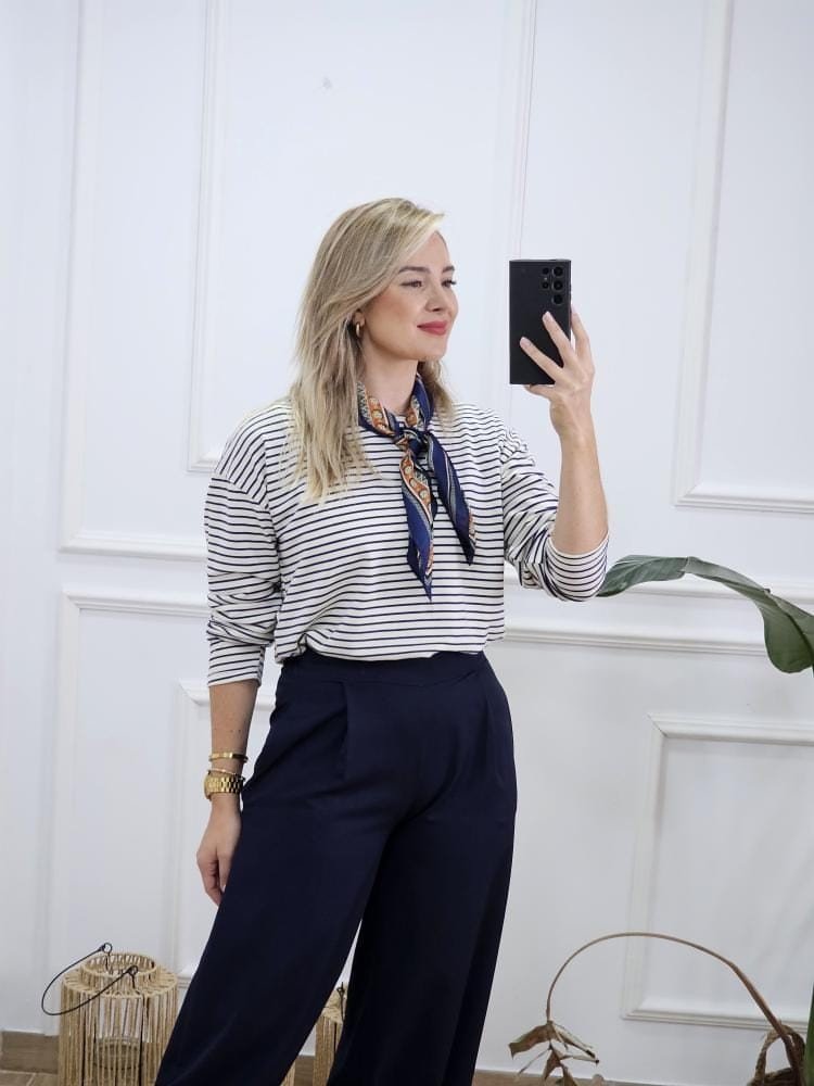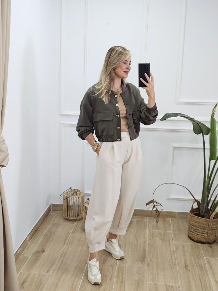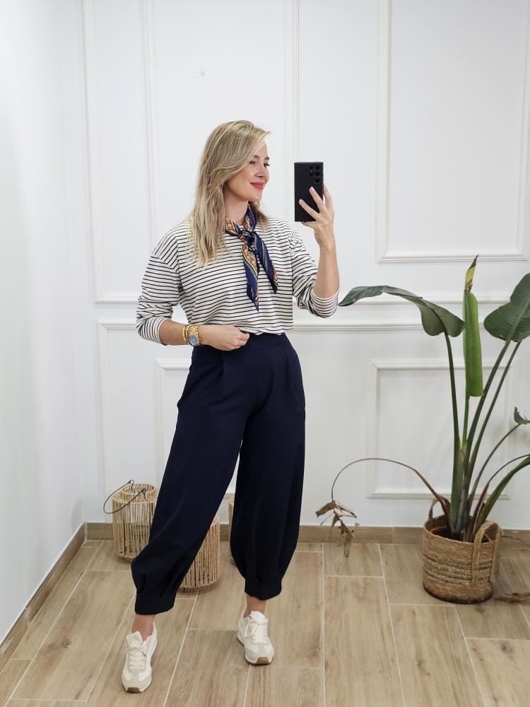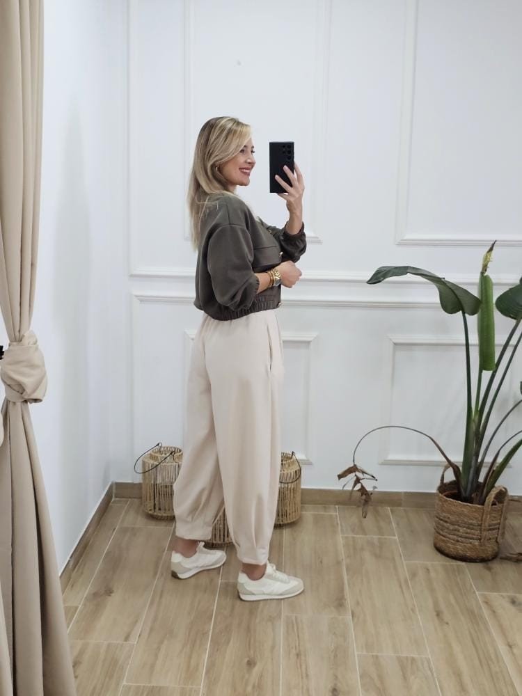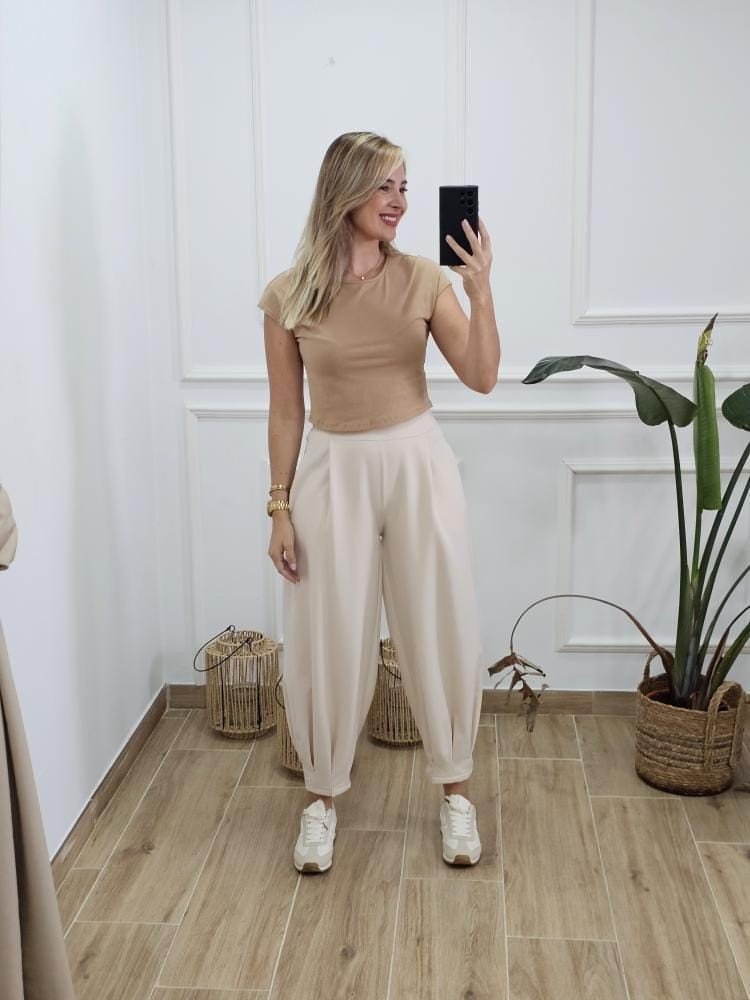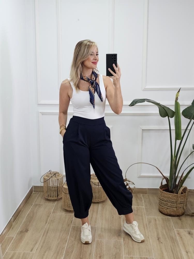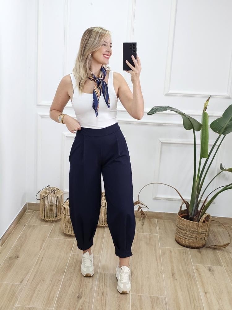 Pantalón en tejido fluido, estilo pinza. Contiene elástico en la zona trasera de la cintura. Detalle de bolsillos delanteros y estilo tobillero. Por tallas y dos colores.