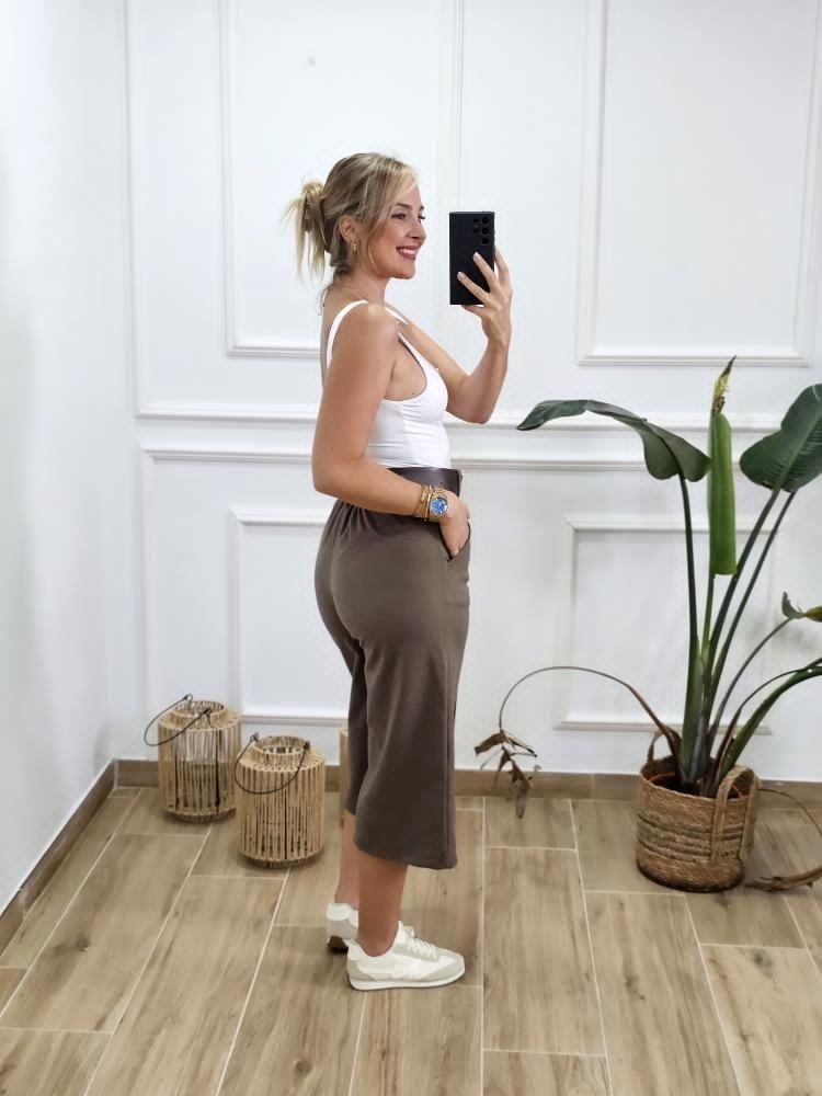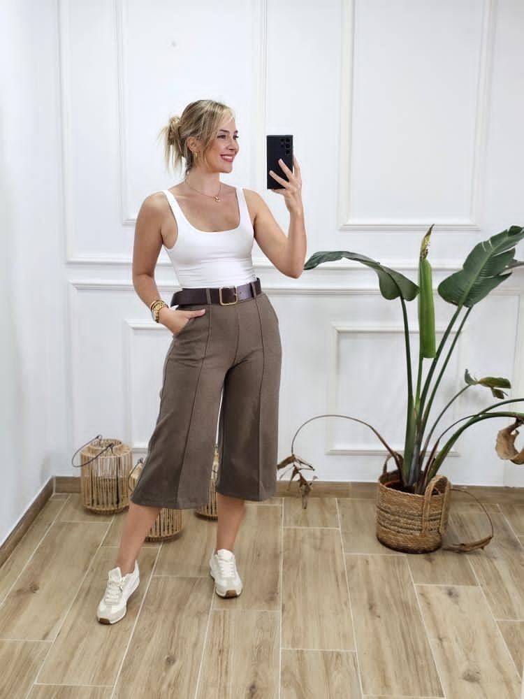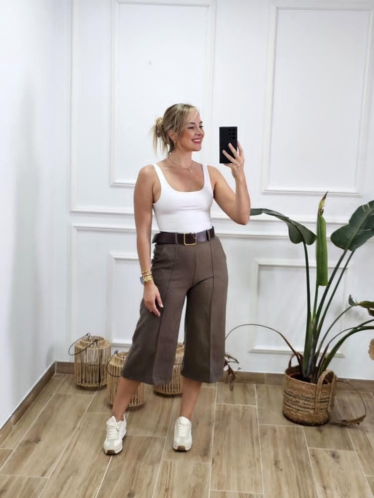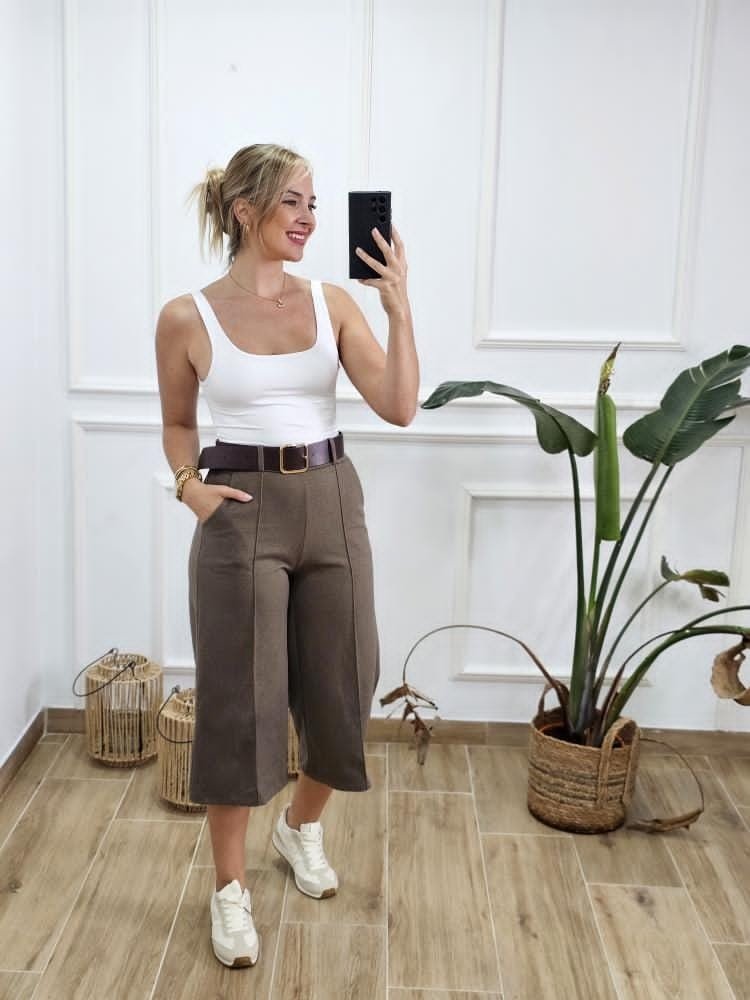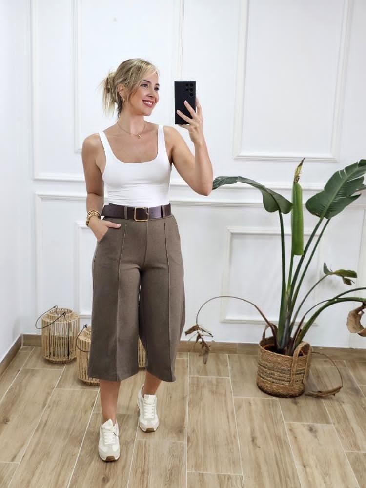 Pantalón estilo culotte. Tejido efecto ante. Contiene elástico en la zona trasera. Detalle de bolsillos en ambos laterales. Incluye cinturón. Talla única y único color.
