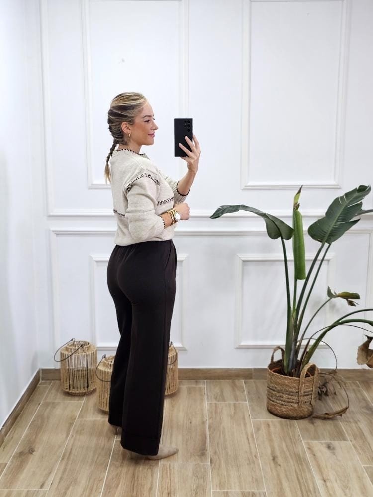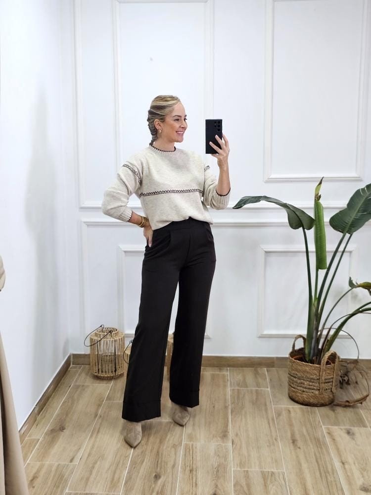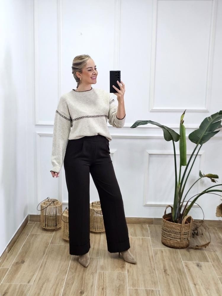 Pantalón en tejido de poliéster con elastano. Contiene pinzas, elástico en la zona de la cintura y detalle de bolsillos en la zona delantera. Por tallas y único color.