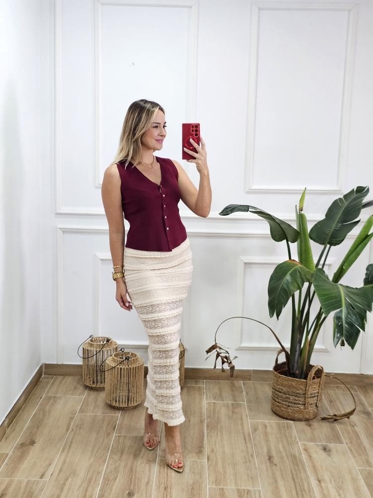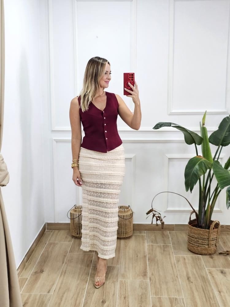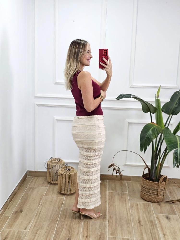 Falda midi en tejido de tull con encaje. Detalle de dibujo en el encaje y pequeños volantes en distintas franjas. Contiene elástico en la zona de la cintura y forro interior estilo minifalda. Por tallas y único color.
