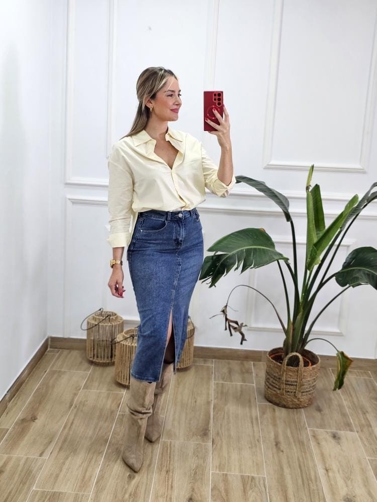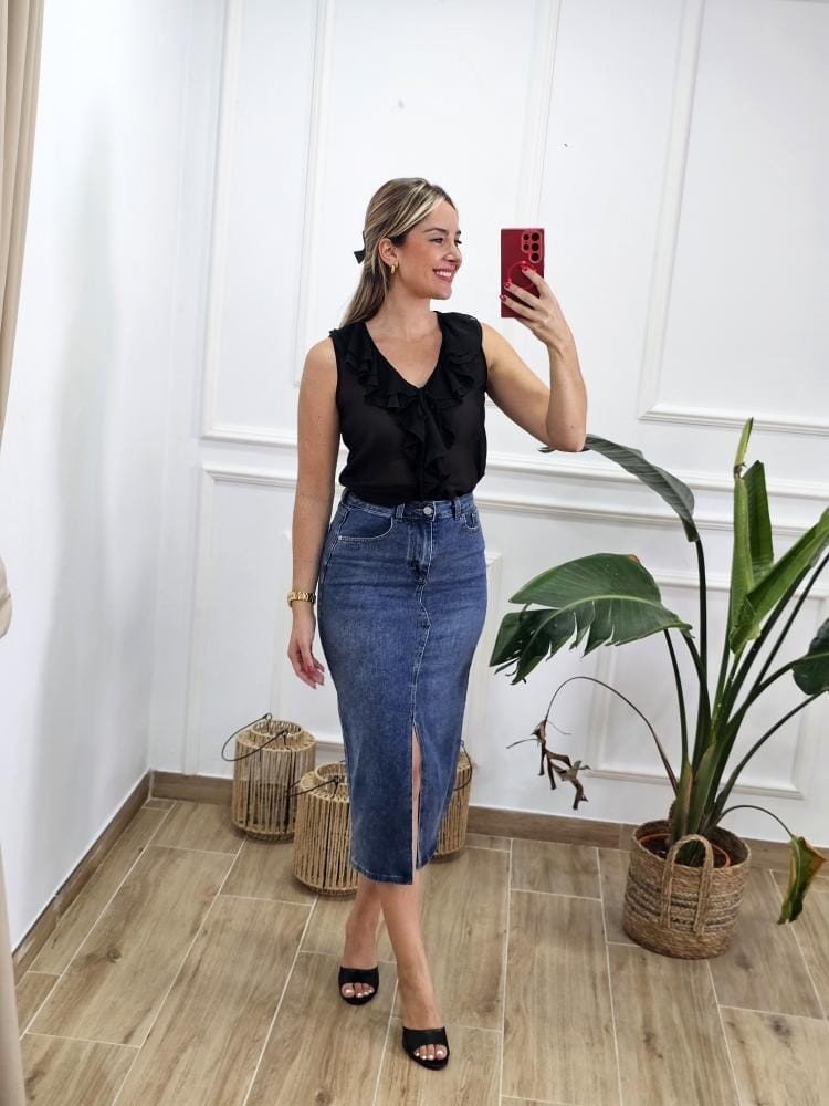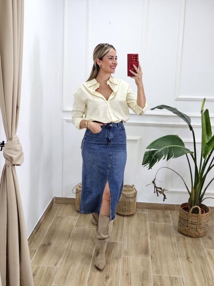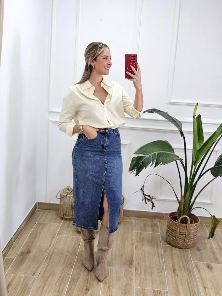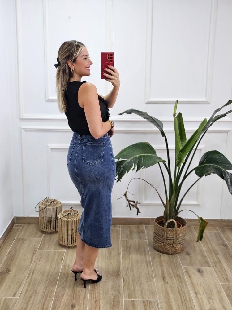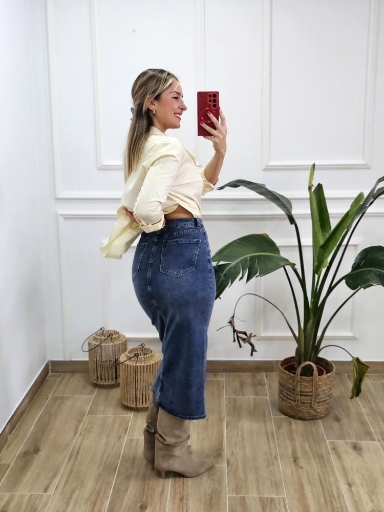 Falda midi en tejido de elastano. Contiene abotonadura en la zona central con cremallera. Bolsillos en ambos laterales y en la zona trasera. Abertura en la zona central. Talla única y único color.
