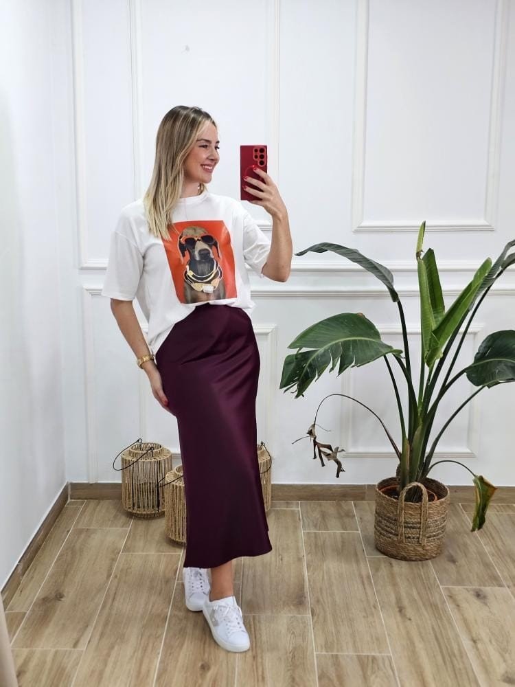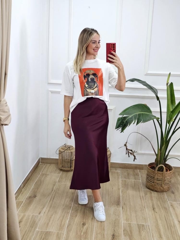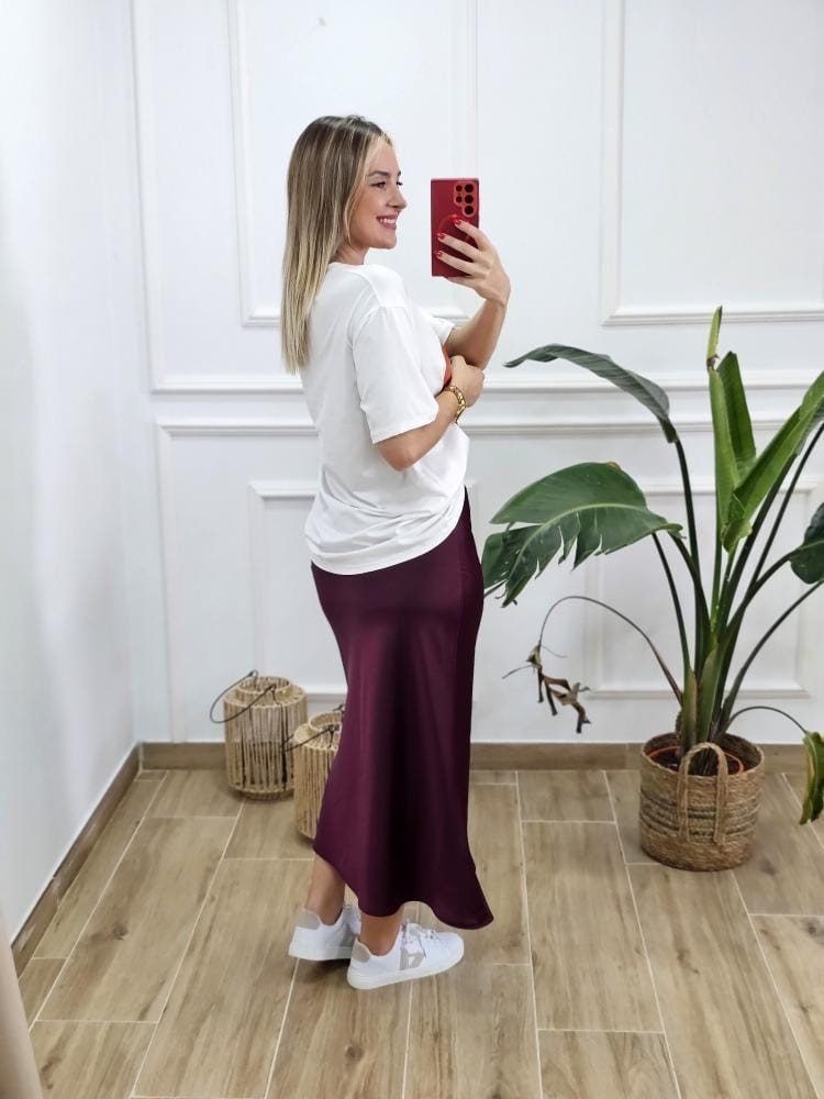 Falda en tejido satinado. Contiene elástico en la zona de la cintura. Talla único y único color.