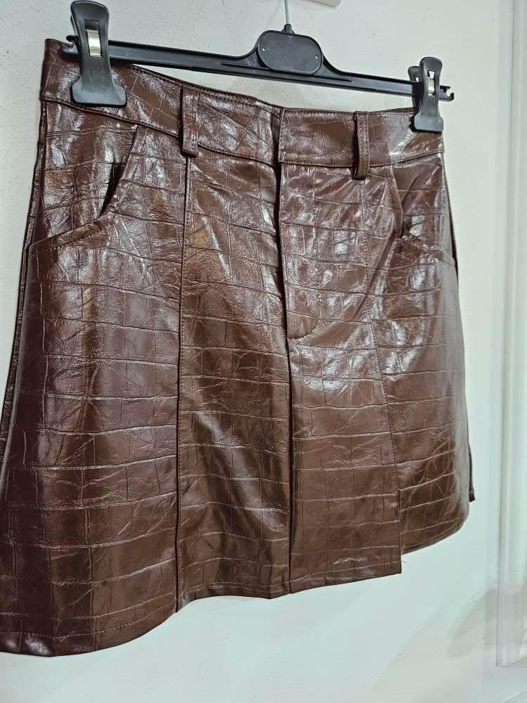 Falda en tejido encerado efecto piel de cocodrilo. Contiene bolsillos en los laterales. Detalle de cremallera y botón en la zona central. Forro interior efecto short. Por tallas y varios colores.