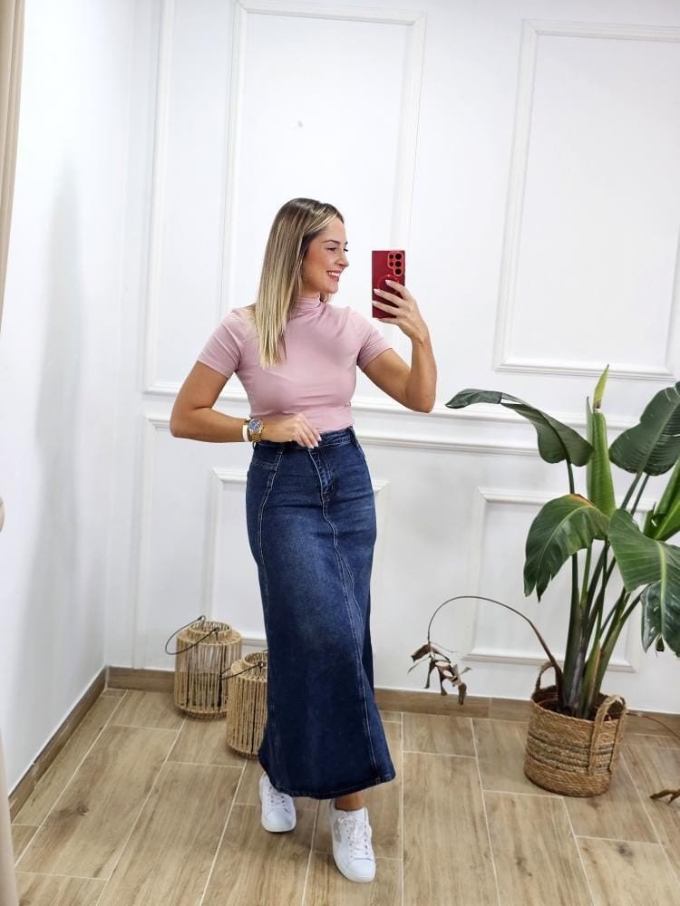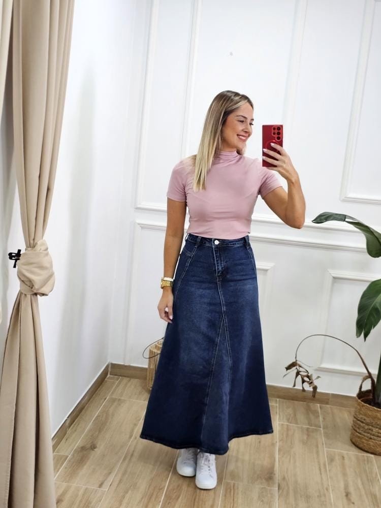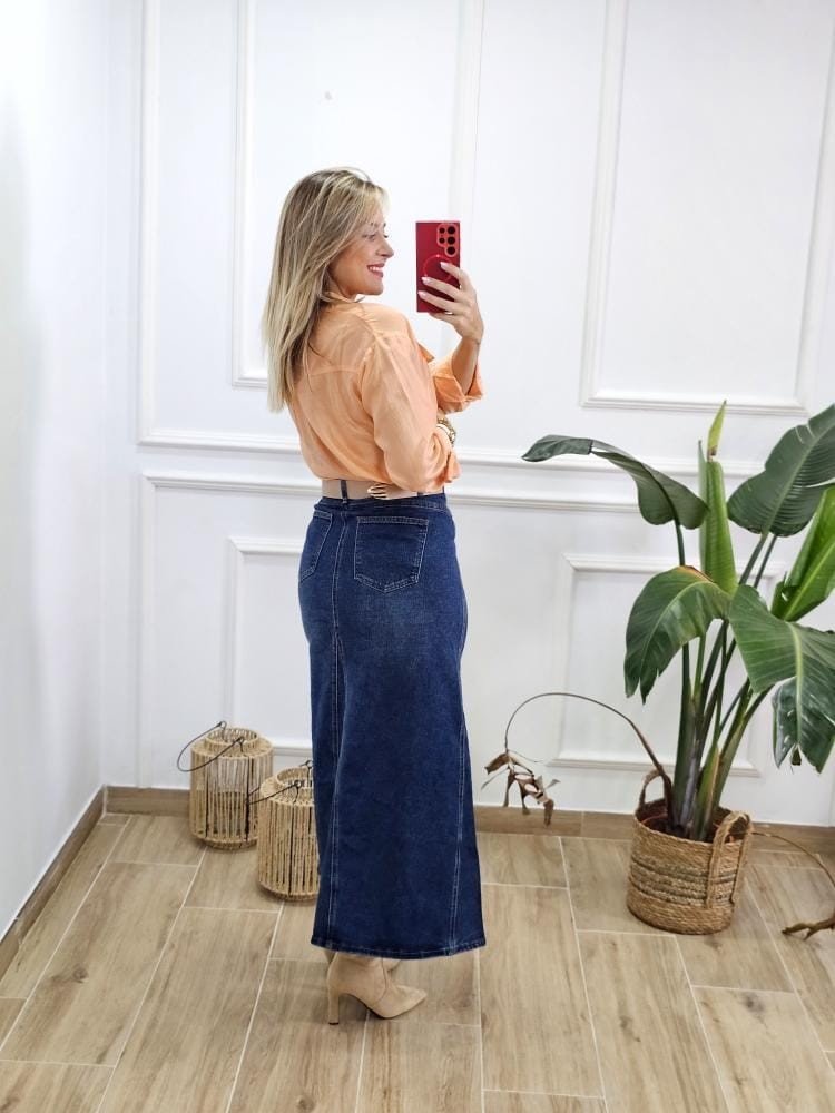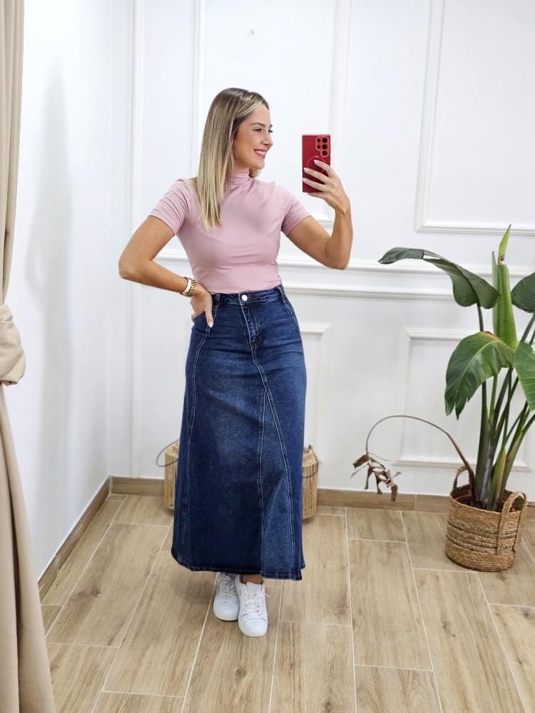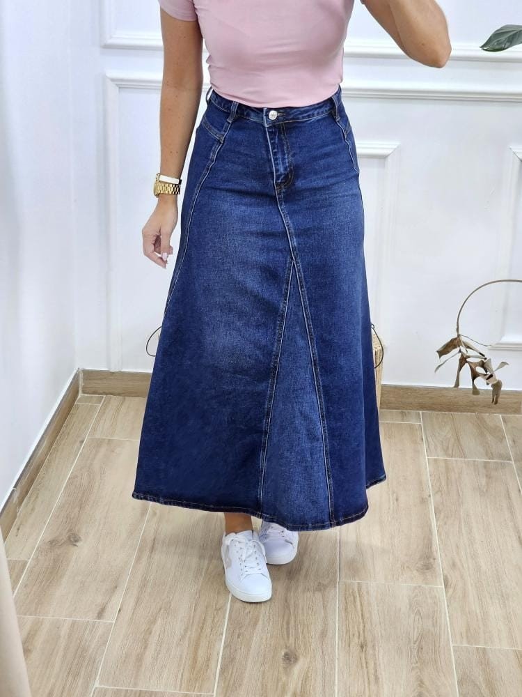 Falda maxi corte A en tejido denim vaquero elástico. Contiene bolsillos en la zona trasera. Detalle de cremallera y botón en la zona central. Talla única y único color.