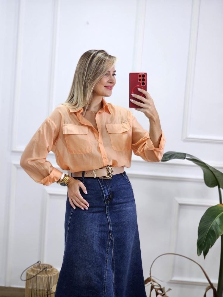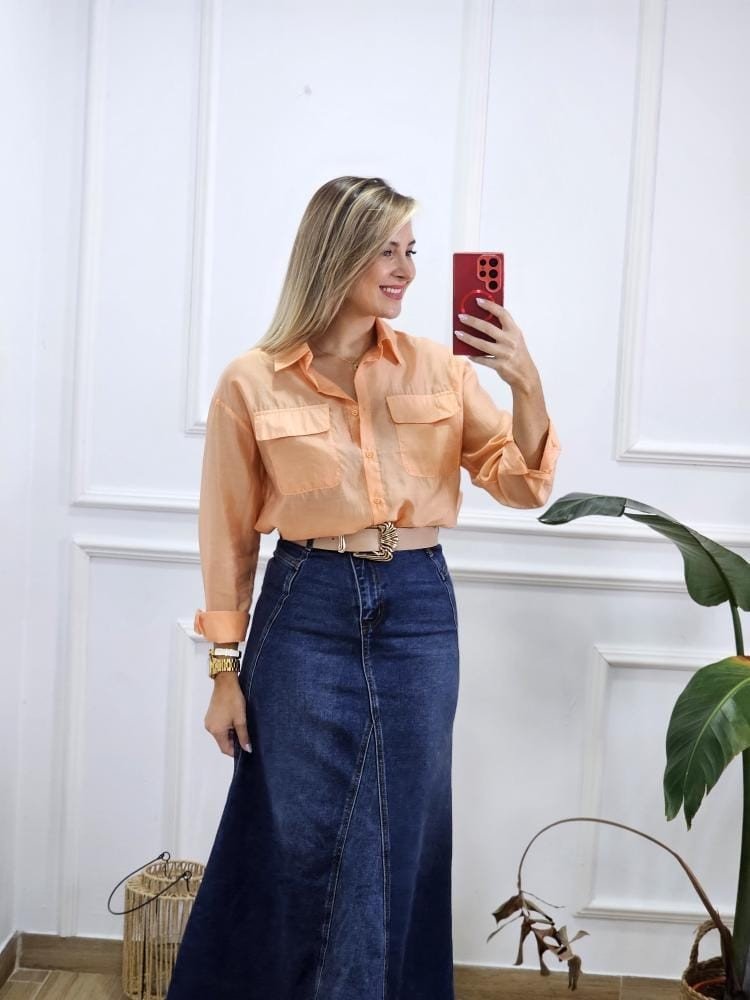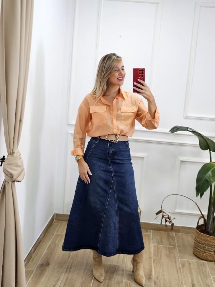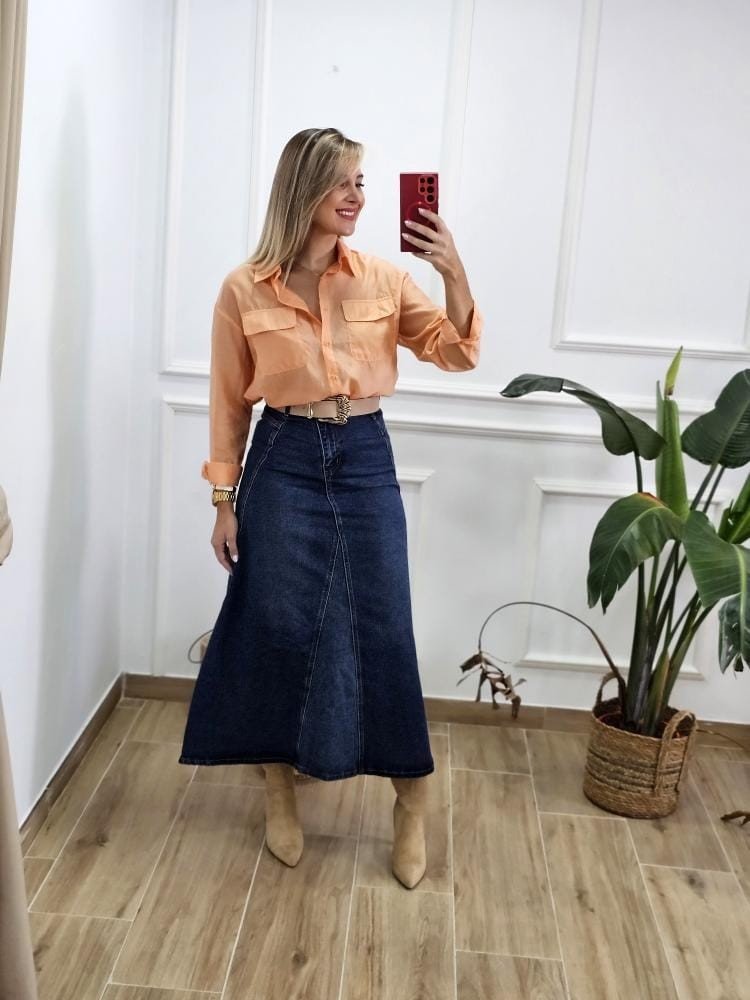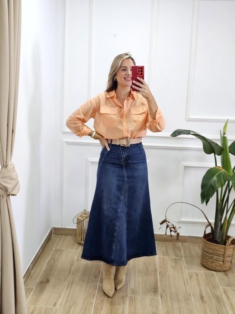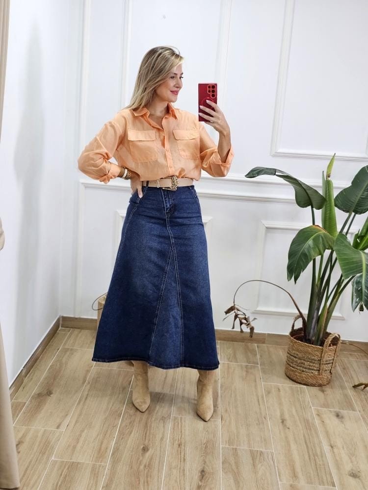 Falda maxi corte A en tejido denim vaquero elástico. Contiene bolsillos en la zona trasera. Detalle de cremallera y botón en la zona central. Talla única y único color.