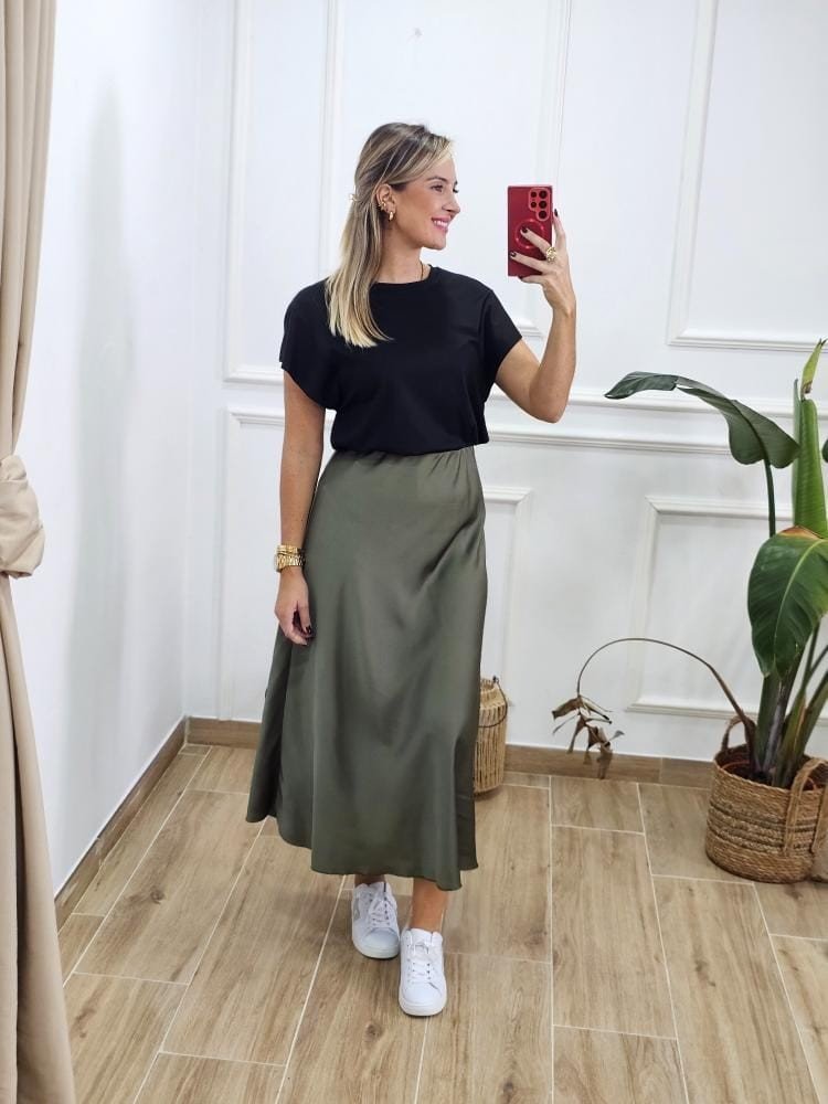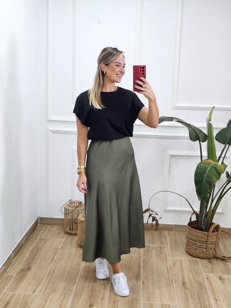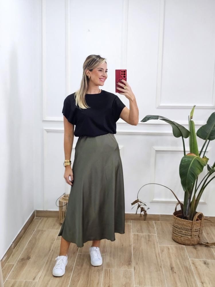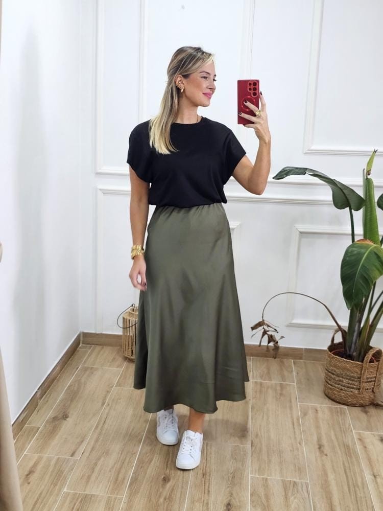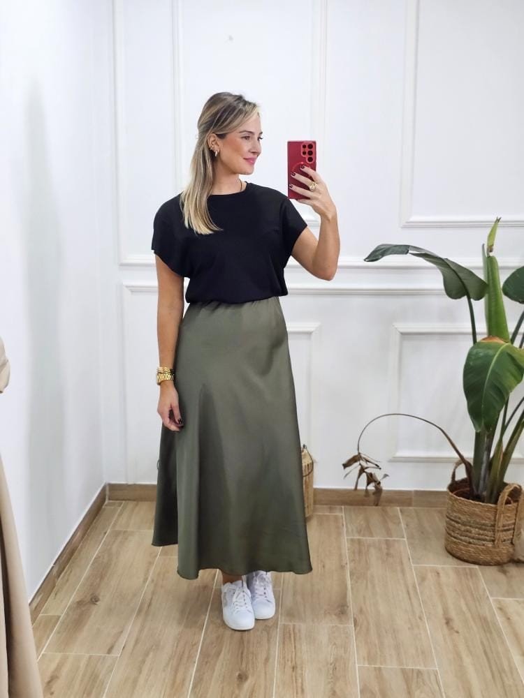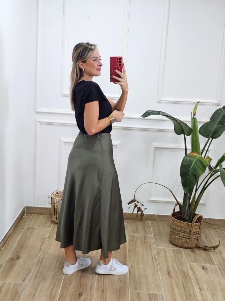 Falda midi en tejido satinado. Contiene pretina elástica en la zona de la cintura. talla única y único color.
