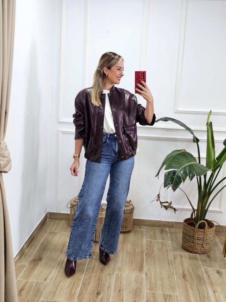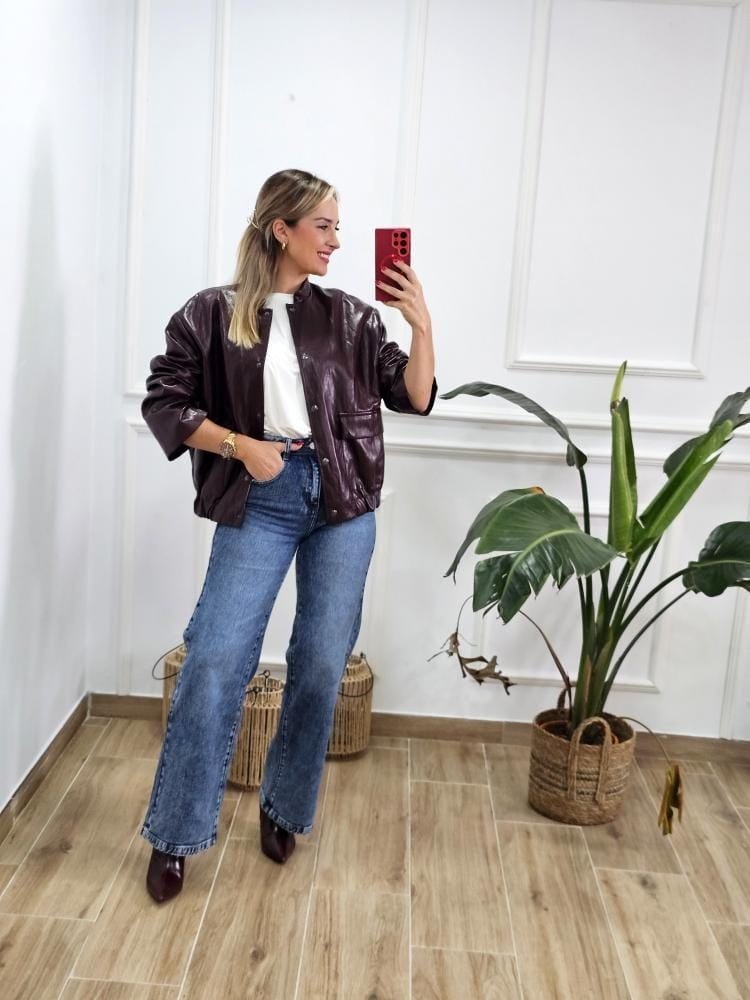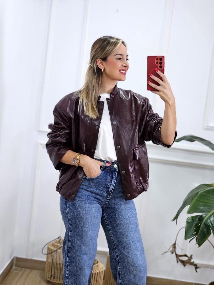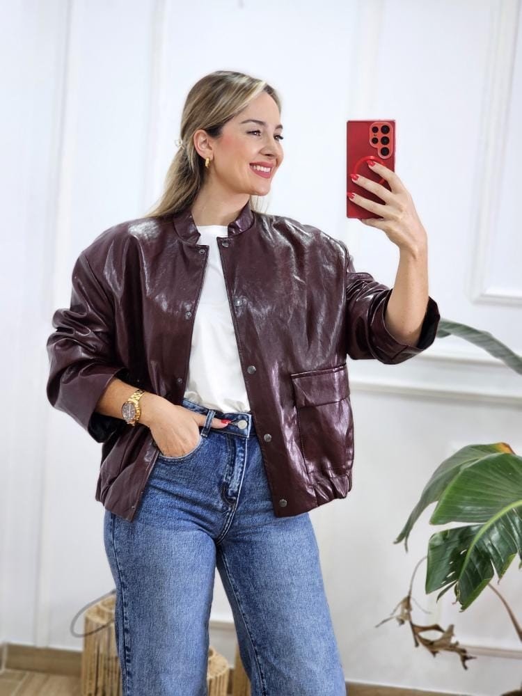 Bomber en tejido de polipiel. Manga baja, cuello mao y botones a presión en la zona delantera. Detalle de bolsillos en la zona delantera y contiene pretina elástica en la zona baja de la misma. Talla única y único color.