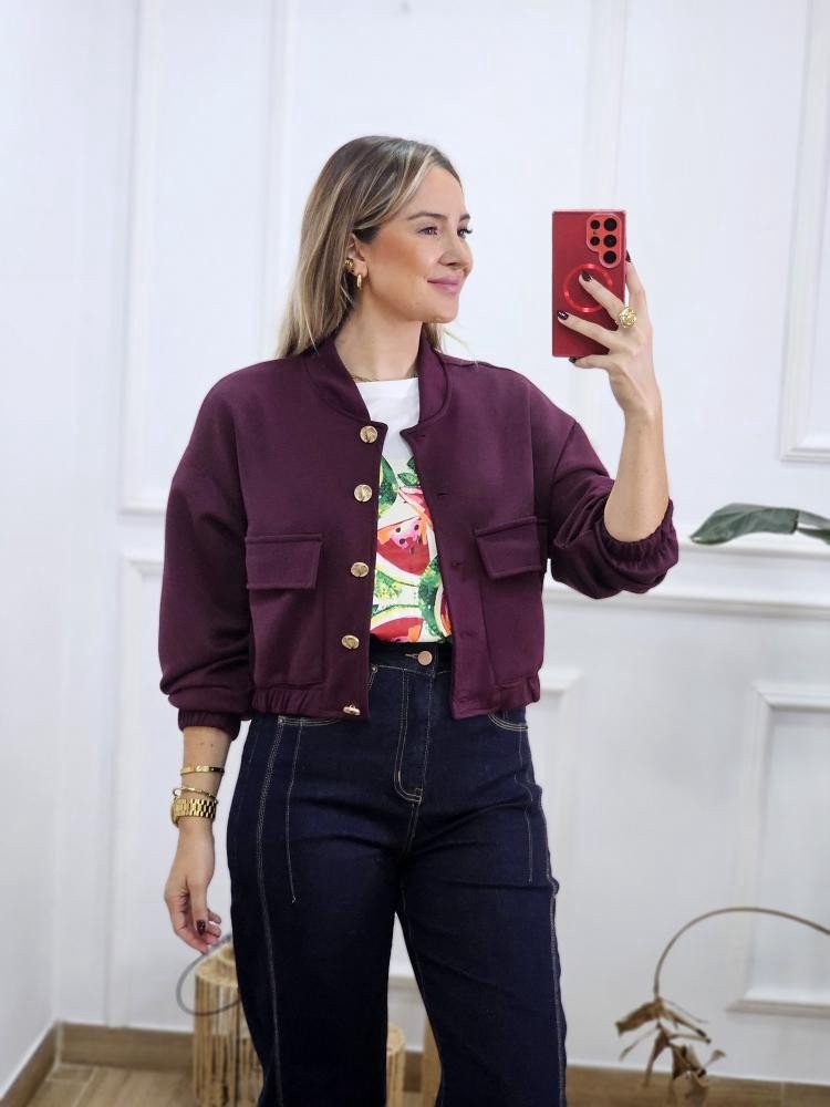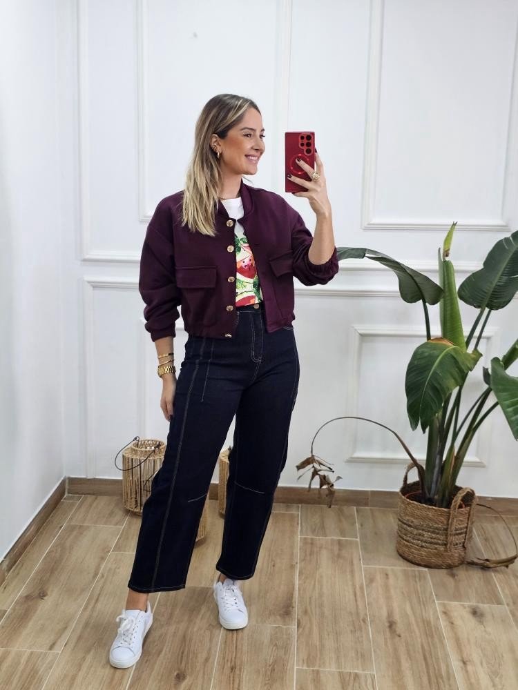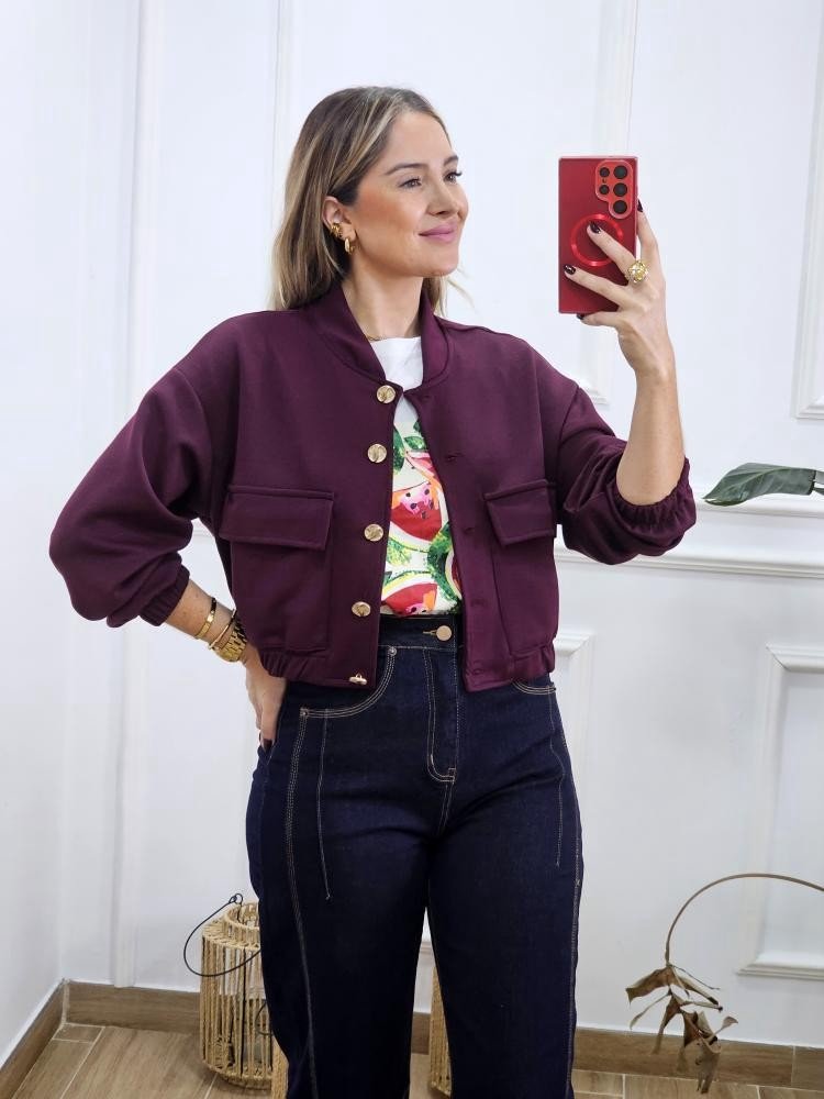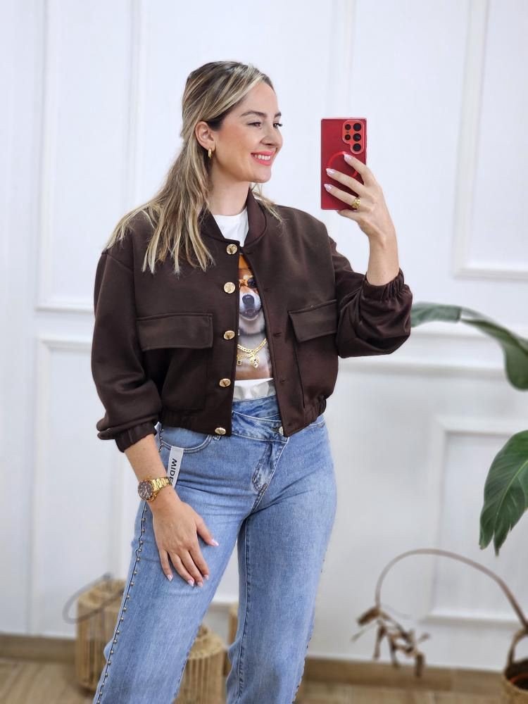 Chaqueta estilo bomber de manga bajo y cuello mao. Detalle de botones dorados en la zona delantera. Bolsillos en ambos laterales con solapa. Elástico en la zona de los puños y cintura. Talla única y único color.