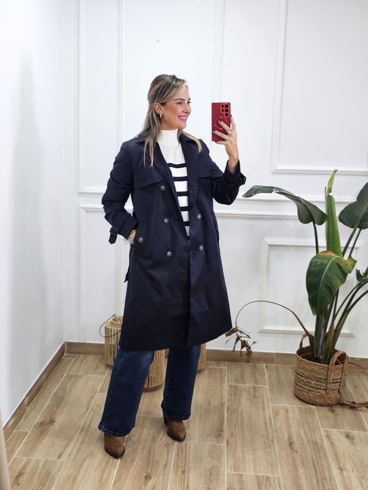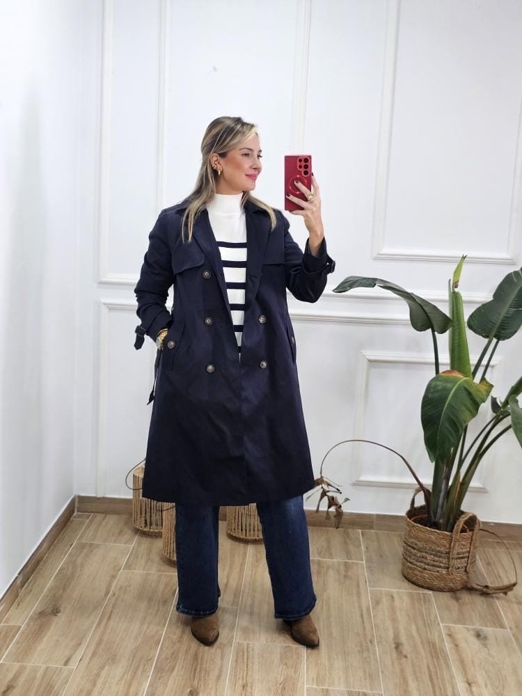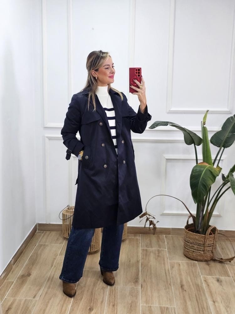Gabardina en tejido ligero. Contiene detalle de doble botonadura en la zona central. Cuello solapado. Detalle de lazada en la zona central. Bolsillos laterales. Contiene forro interior. Por tallas y único color.