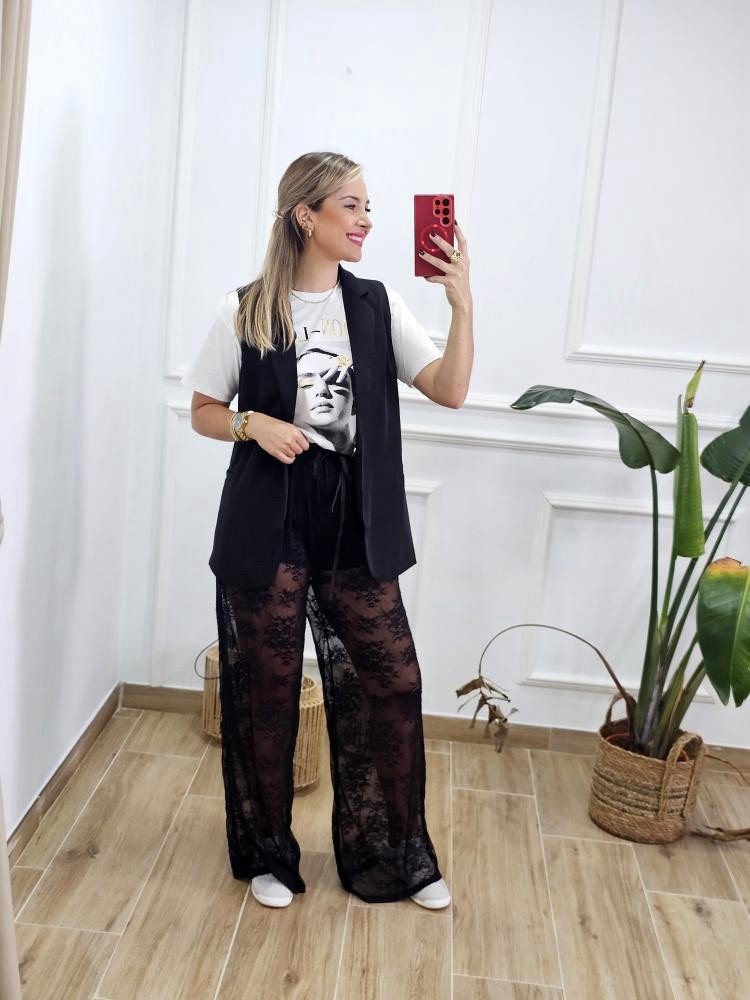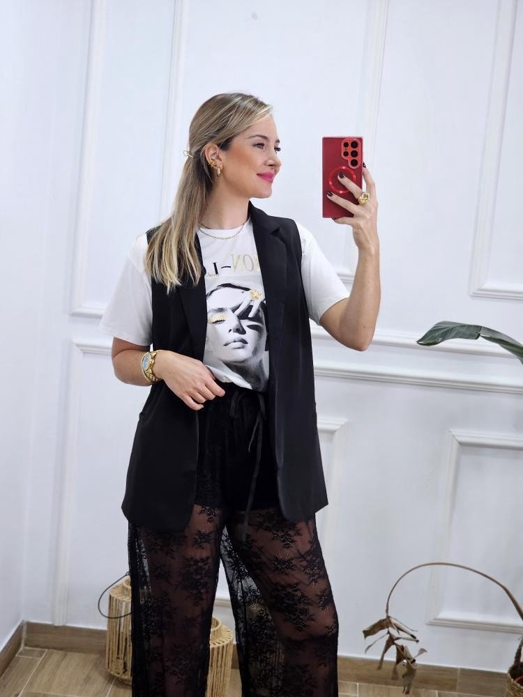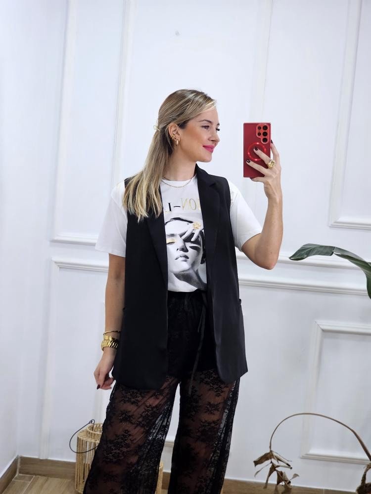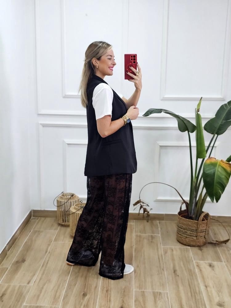 Chaleco en tejido fluido. Contiene cuello solapado. Detalle de falsos bolsillos en la parte delantera. Contiene forro interior. Por tallas y único color.