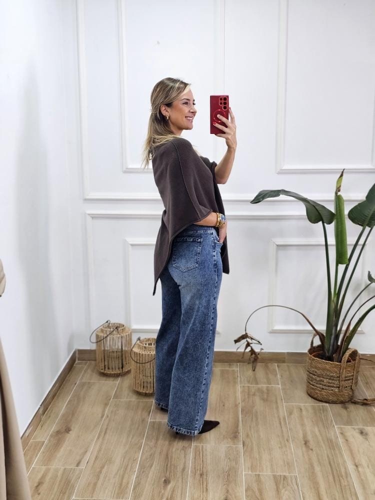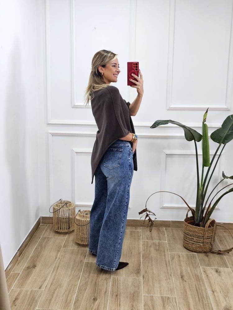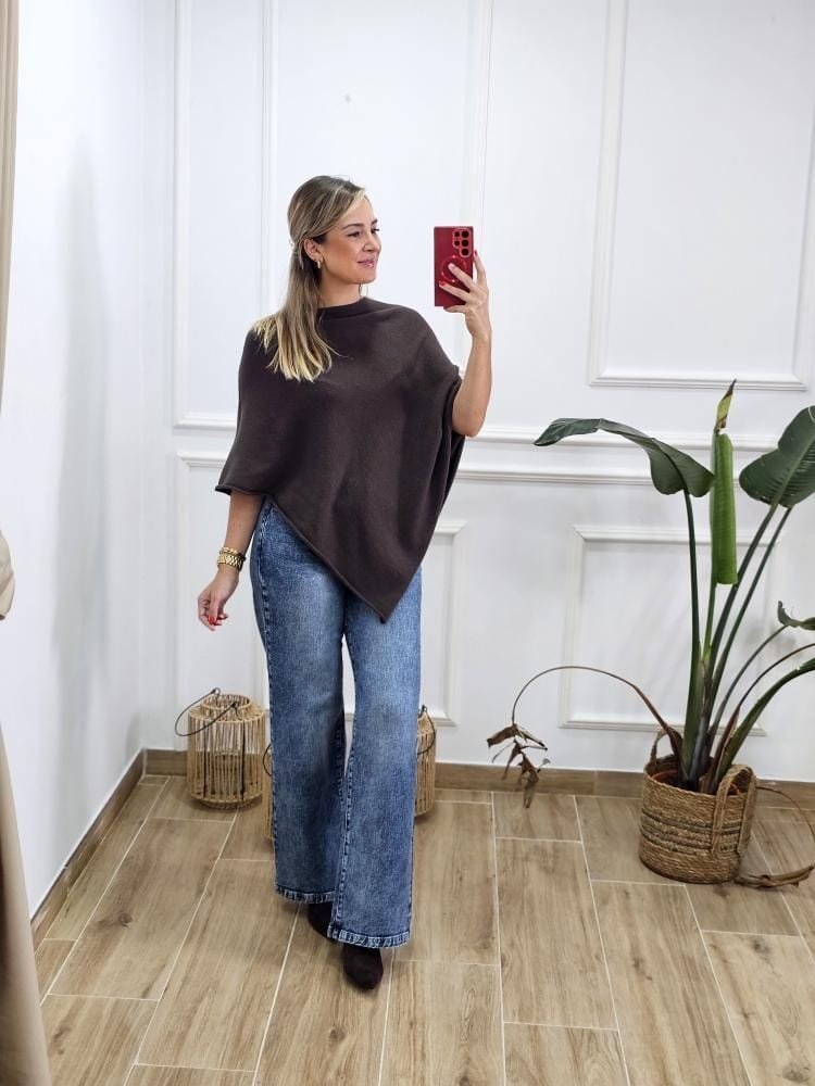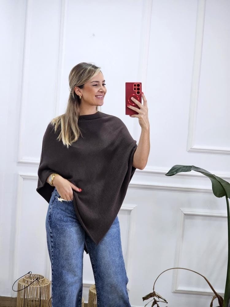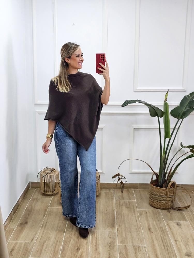 Poncho en tejido de punto asimétrico. Cuello redondo y terminaciones en punta. Talla única y único color.