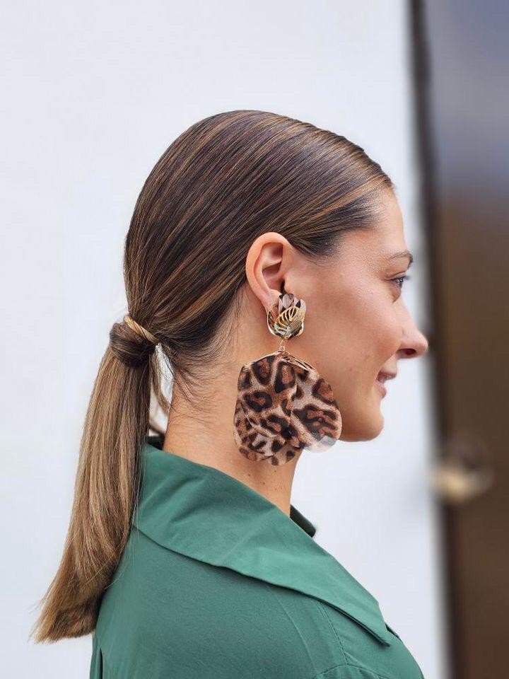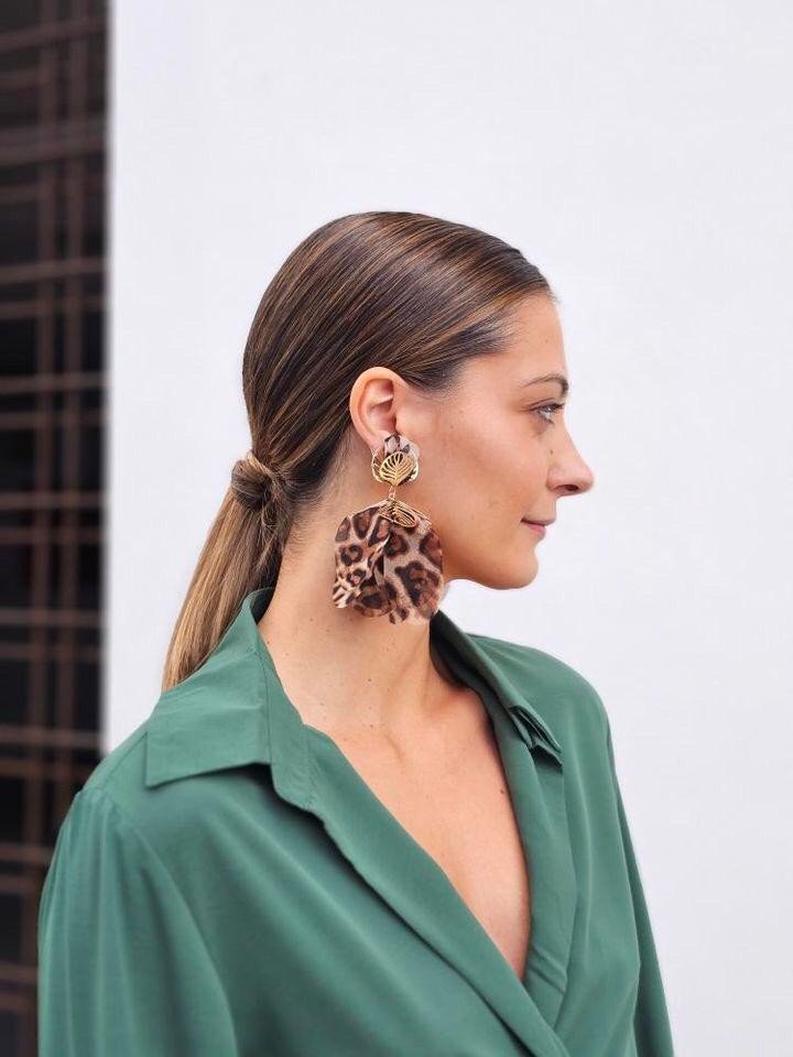 Pendiente con detalle dorado con pétalos en tela estampados en animal print. LOS ACCESORIOS NO TIENEN OPCIÓN A CAMBIOS.