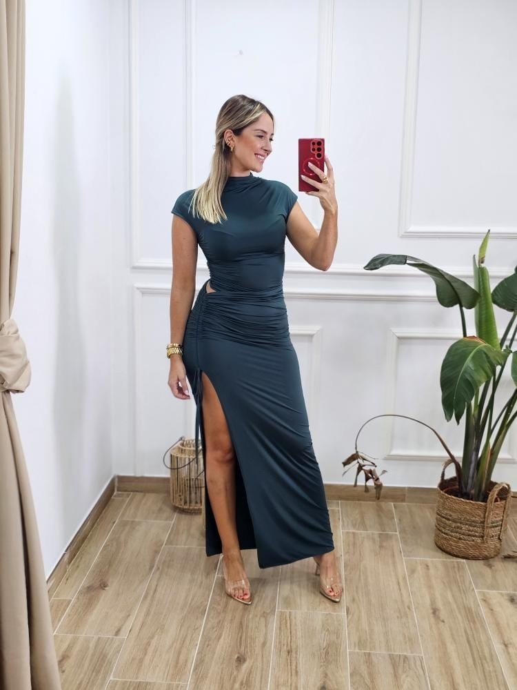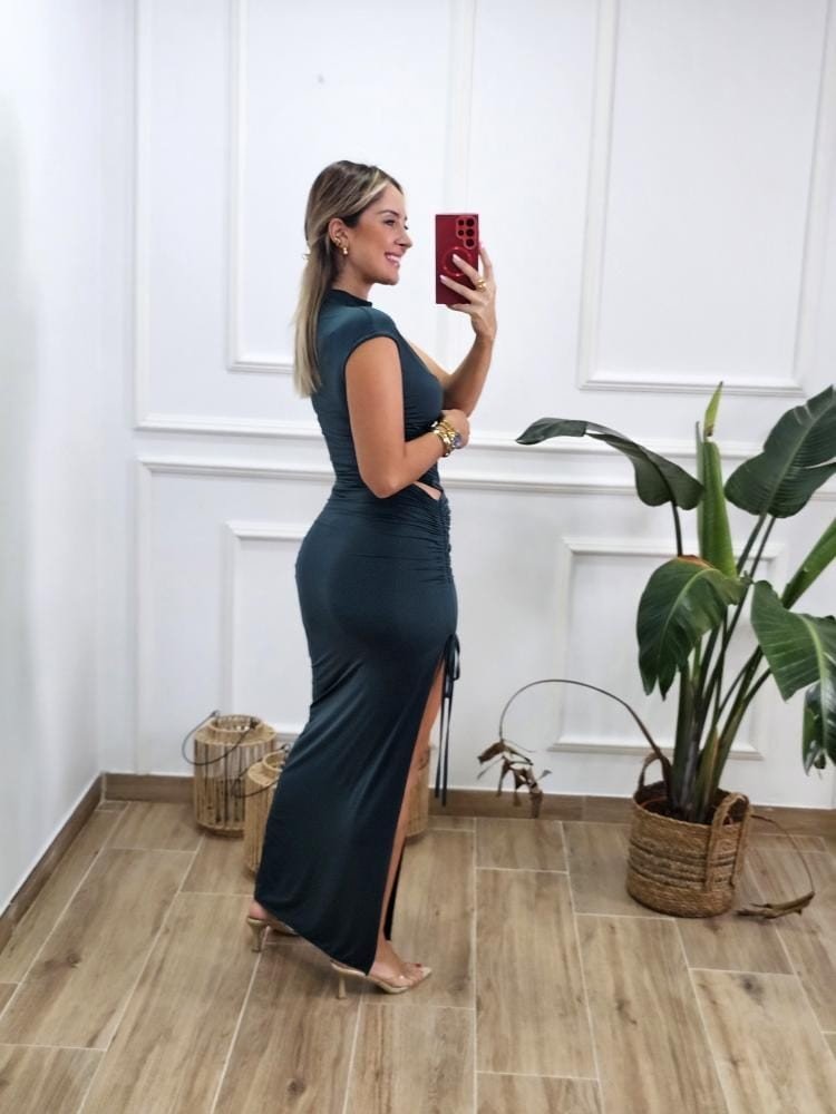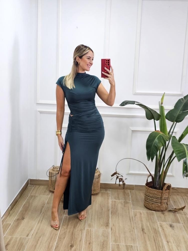 COLECCIÓN EVENTO. Vestido bajo en tejido de licra efecto dos piezas. Detalle de cut out con fruncido. Abertura en el bajo de la falda. Talla única y varios colores. LA COLECCIÓN EVENTOS NO TIENE OPCIÓN A CAMBIOS.