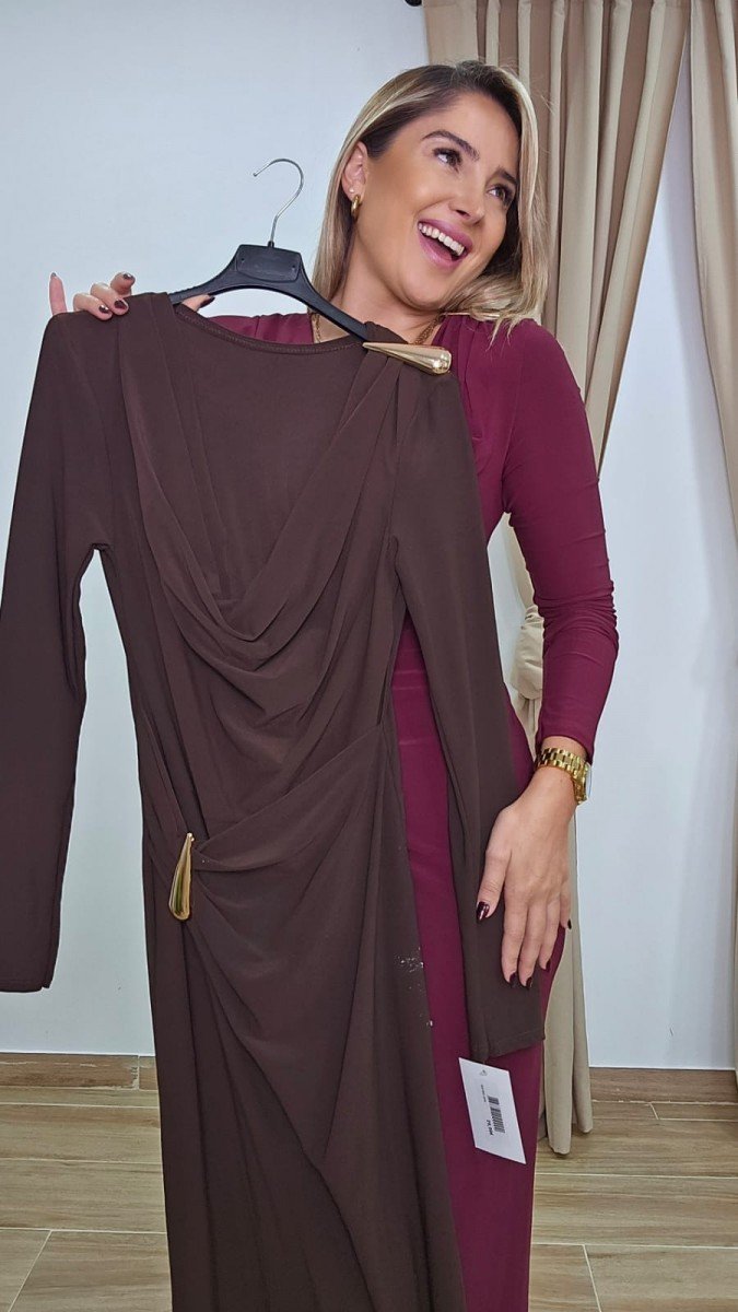 COLECCIÓN EVENTOS SIN OPCIÓN A CAMBIO. Vestido bajo en tejido elástico. Contiene manga baja. Escote en buche. Detalle de apliques en color dorado. talla única y en varios colores.