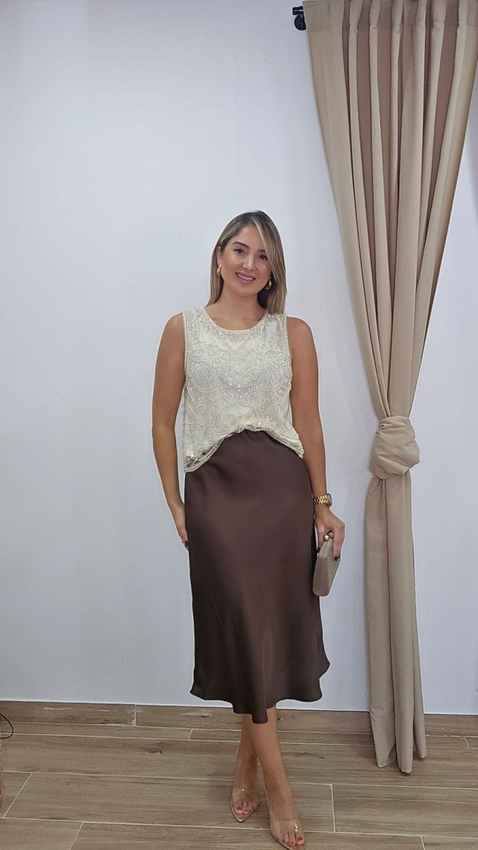 TOP DE COLECCIÓN DE ECNTOS IN OPCIÓN A CAMBIOS. Top de tejido de tull con pedrería. Cuello redondo y sin mangas. Detalle de botón en la zona del cuello. Por tallas y único color.
