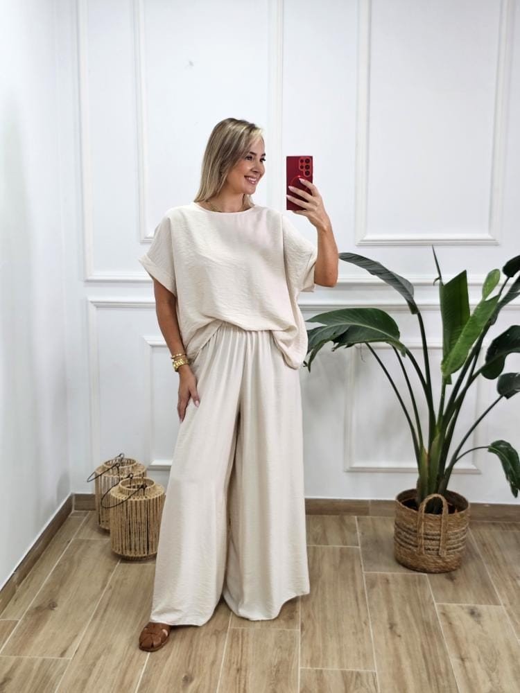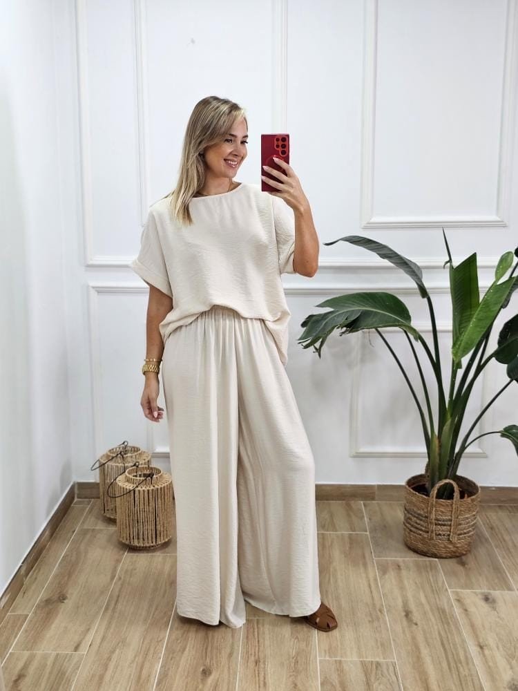Conjunto de dos piezas compuesto por pantalón y blusa en tejido ligero. Blusa de manga corta con detalle de cuello redondo. Pantalón efecto fluido con pretina elástica en la zona de la cintura. Talla única y varios colores.