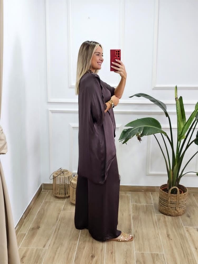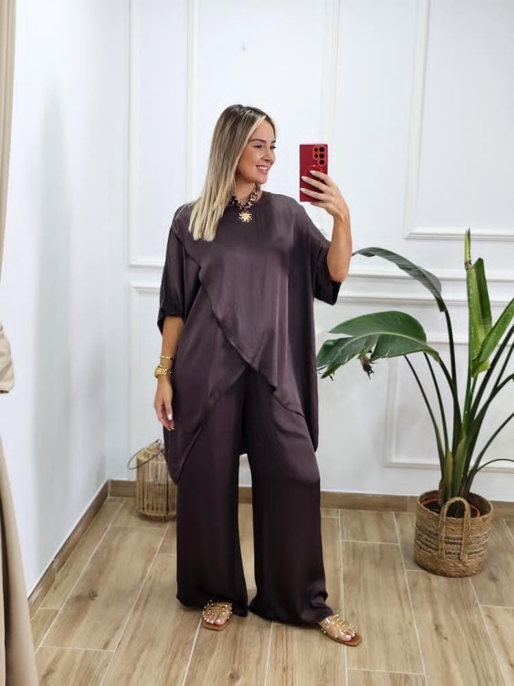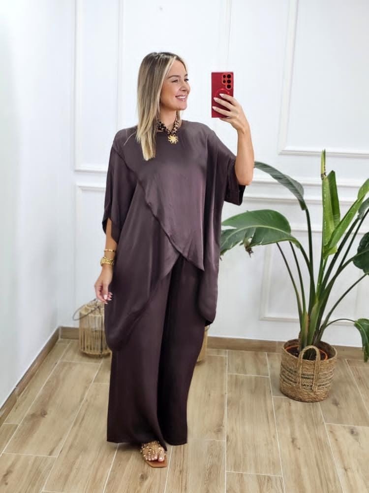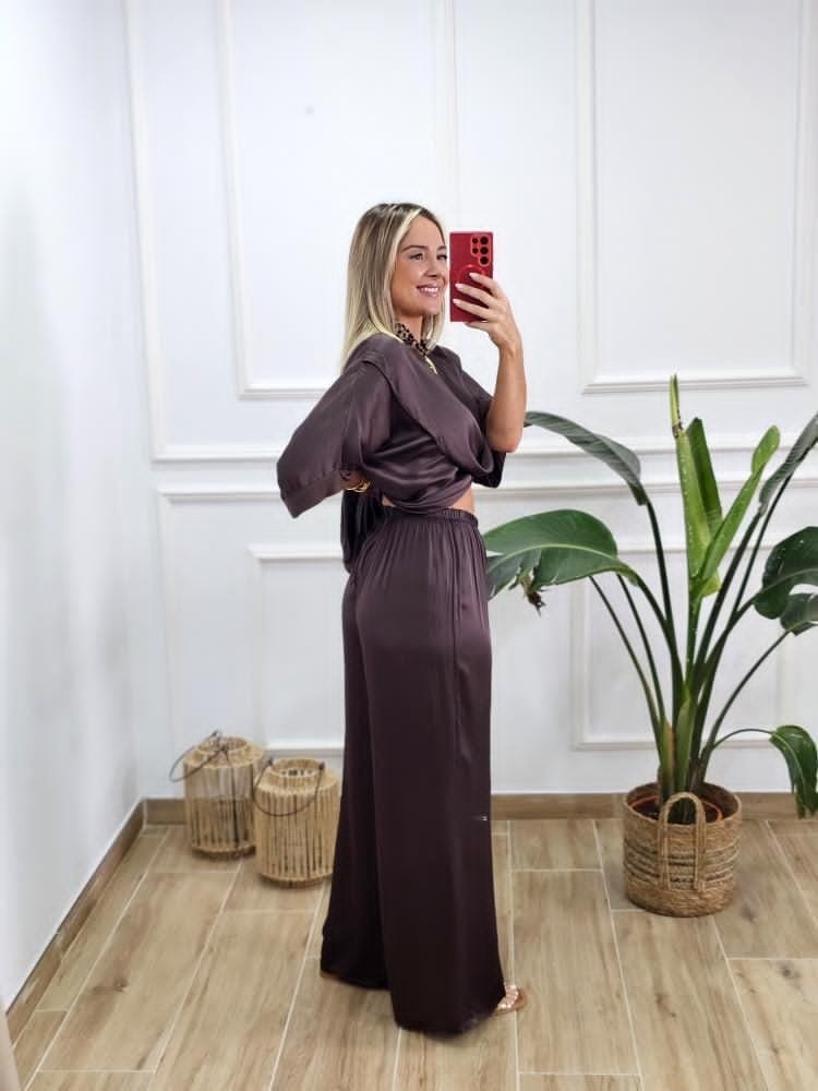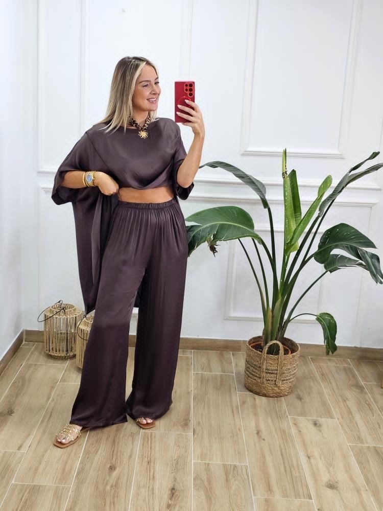 Conjunto de dos piezas compuesto por blusa y pantalón en tejido satinado. Blusa de manga corta estilo murciélago. Escote redondo. Solapada en la zona del pecho con efecto volante. Pantalón palazzo con elástico en la zona de la cintura. Talla única y único color.