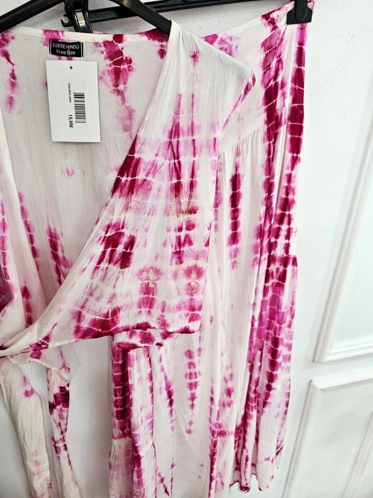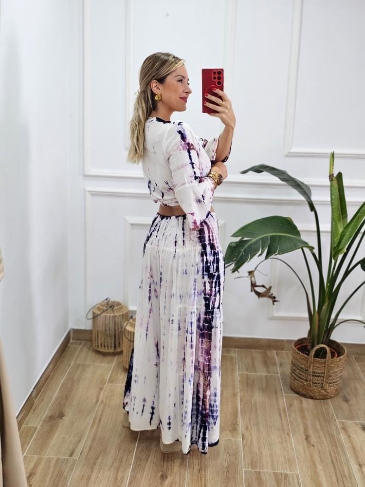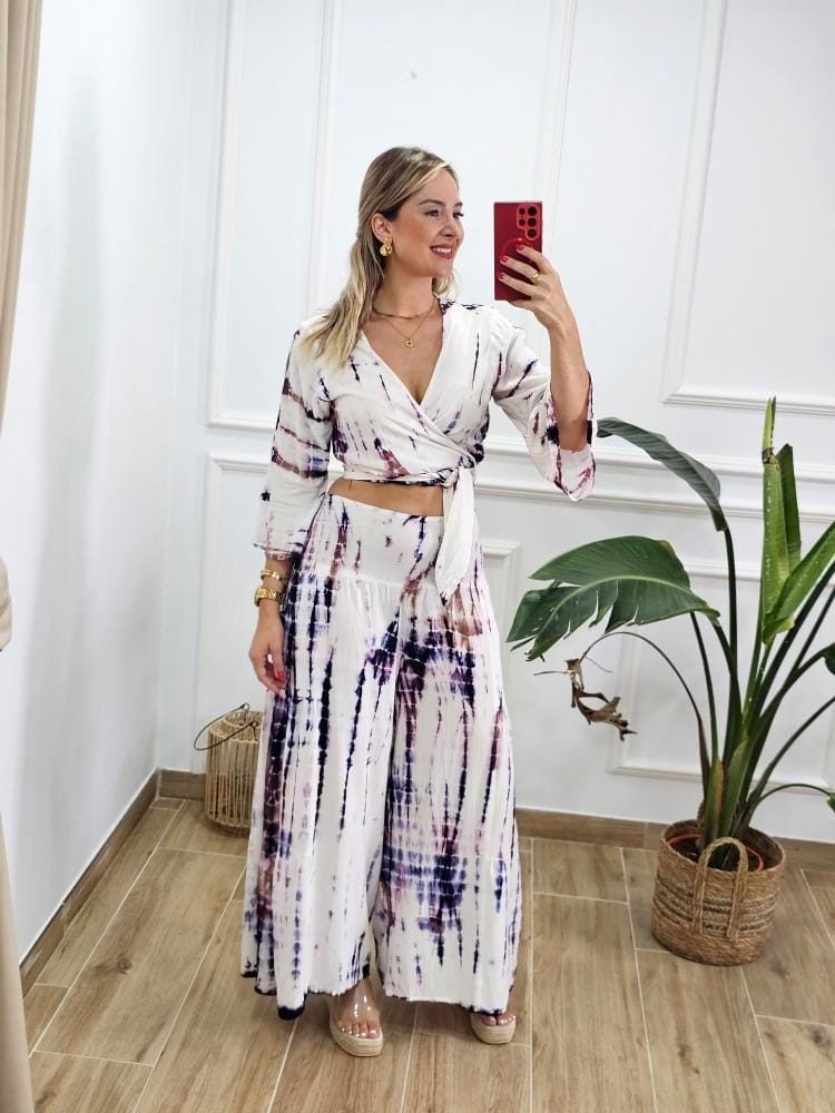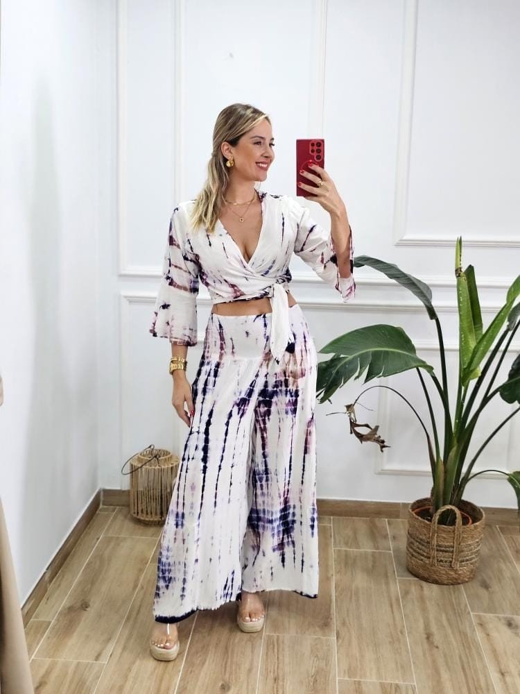 Conjunto en tejido fluido, compuesto de dos piezas. Top de manga 3/4, con terminación en campana y lazada para ajustar en la zona central. Pantalón, con detalle de pretina en nido de abeja en la zona trasera de la cintura y detalle de bolsillos en la zona delantera. Talla única y dos colores.