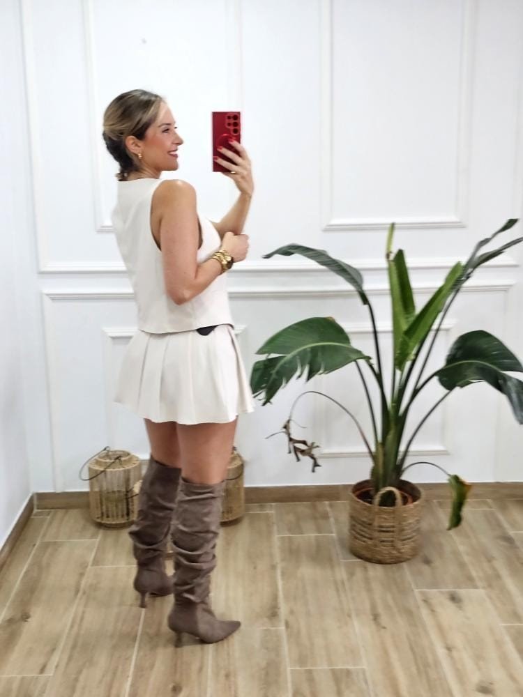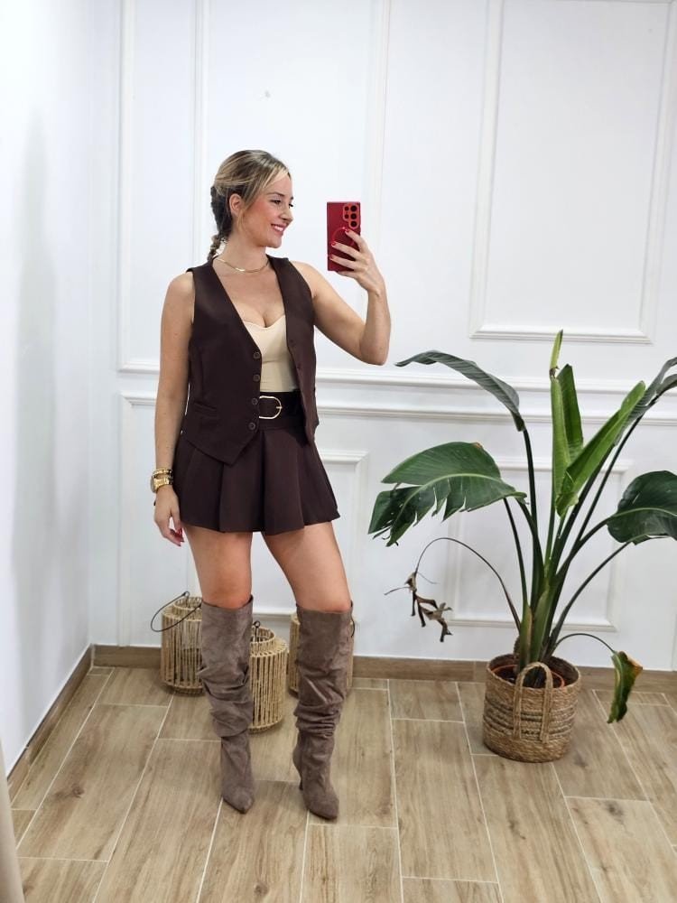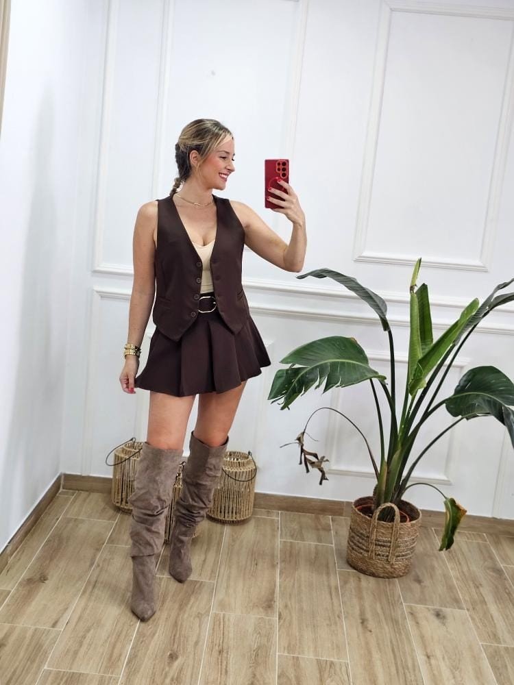 Conjunto compuesto de dos piezas. Chaleco con escote en pico, botones en la zona delantera y detalle de falsos bolsillos delanteros. Falda pantalón conde talle de tablas, incluye cinturón ancho. Por tallas y dos colores.