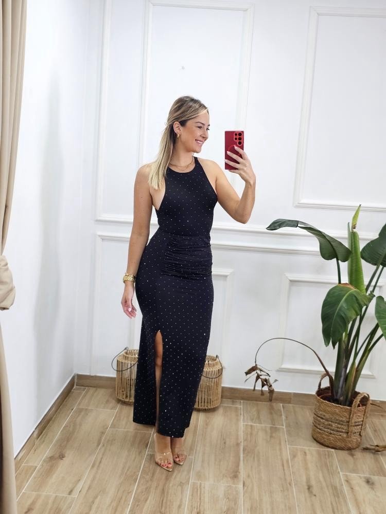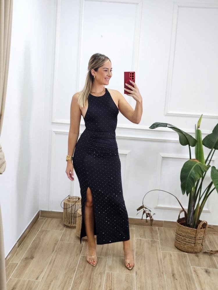 Conjunto en tejido elástico con strass compuesto por body y falda. Body de asillas finas, cuello redondo y corchete en la zona baja de la prenda. Falda de tuno con abertura y fruncido en un lateral. Elástico en la zona de la cintura. Por talla y único color.