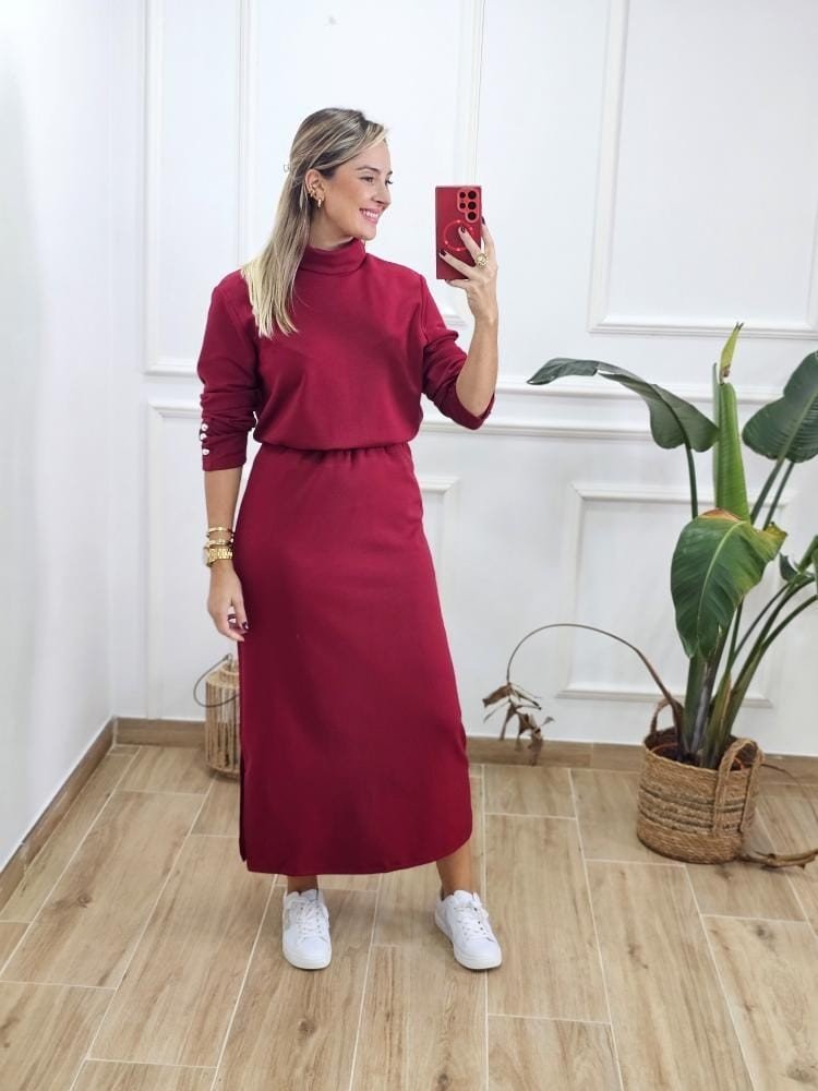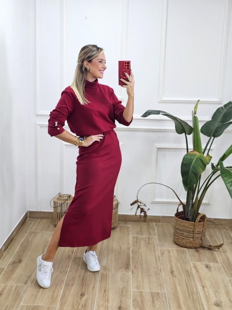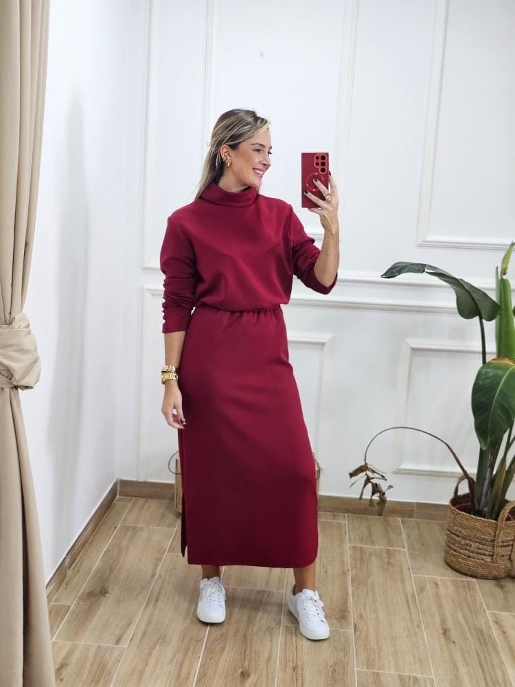 Conjunto de dos piezas en tejido de algodón compuesto por falda y jersey. Jersey de cuello vuelto. Contiene manga baja con detalle de botones joya en la zona de la manga. Falda midi con pretina elástica en la zona de la cintura. Abertura en uno de los laterales. Por tallas y varios colores.